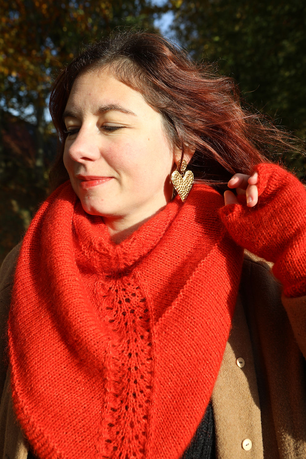Mes mitaines sont réalisées avec 1 pelote de N°1 – Mérinos (100% Mérinos superwash - 200m pour 50gr) et 1 pelote de N°3 – Mohair Soie (72% Fine Kid Mohair et 28% Soie - 210m pour 25gr) de chez Lolilafée en coloris Tango.